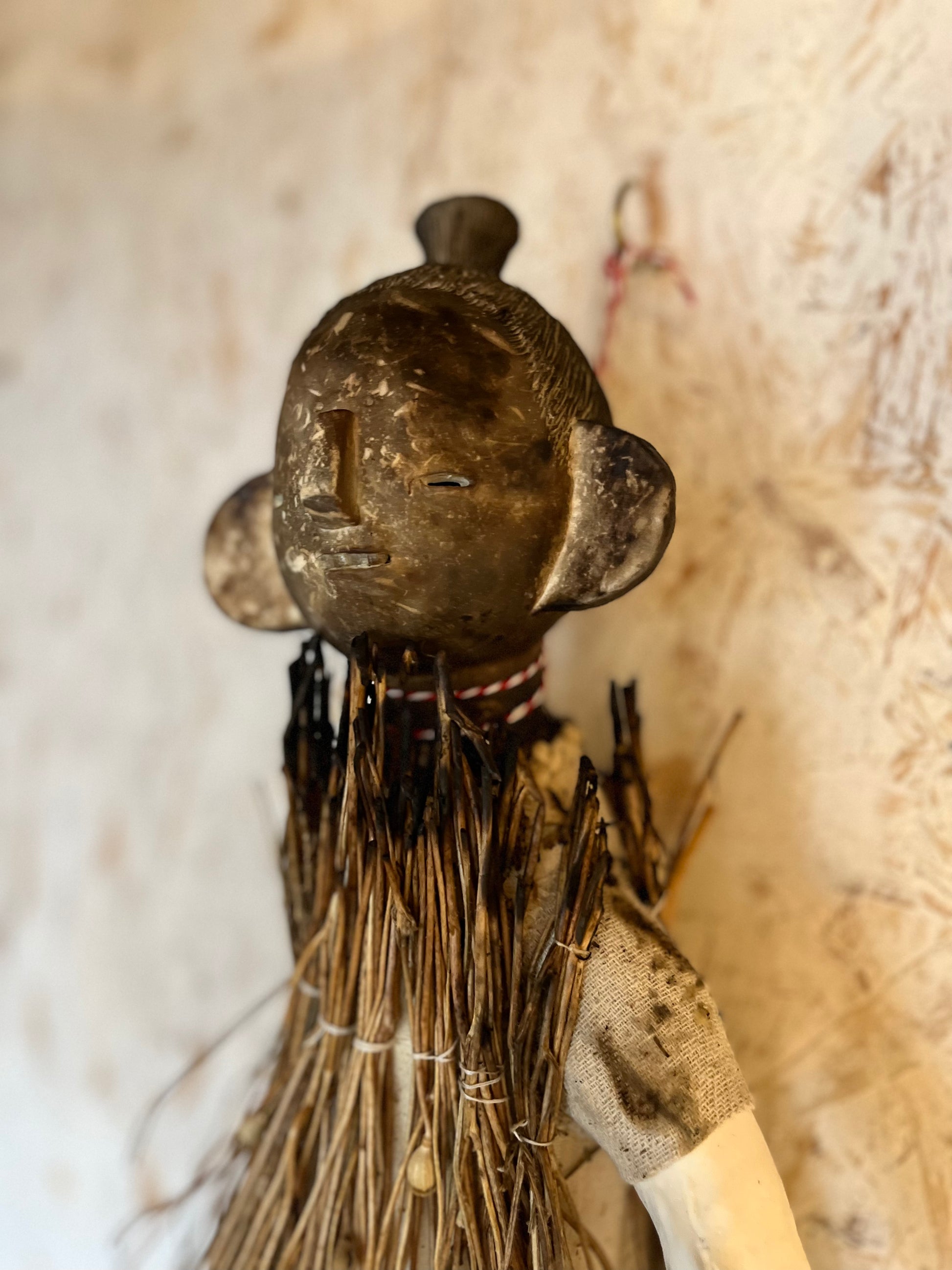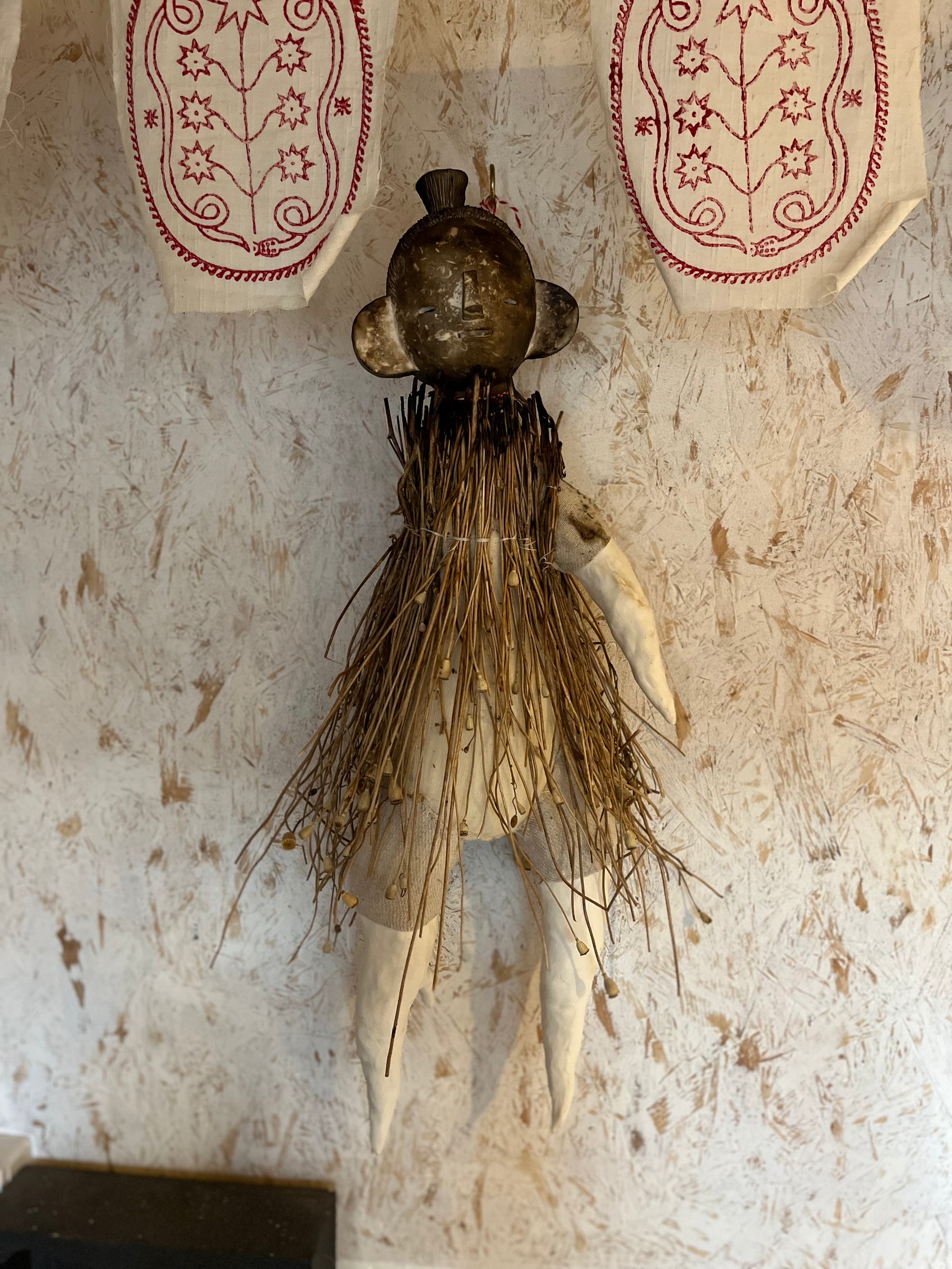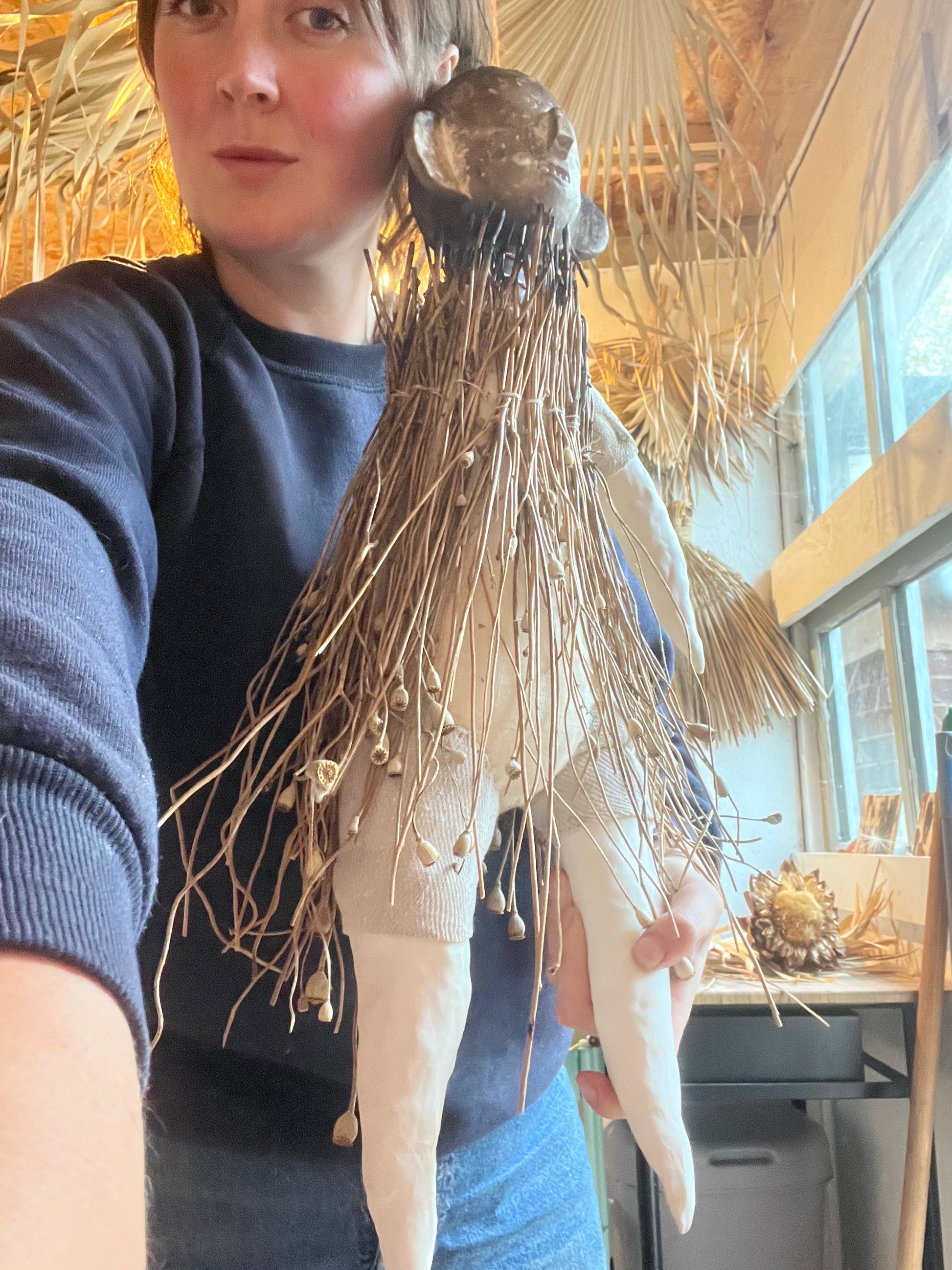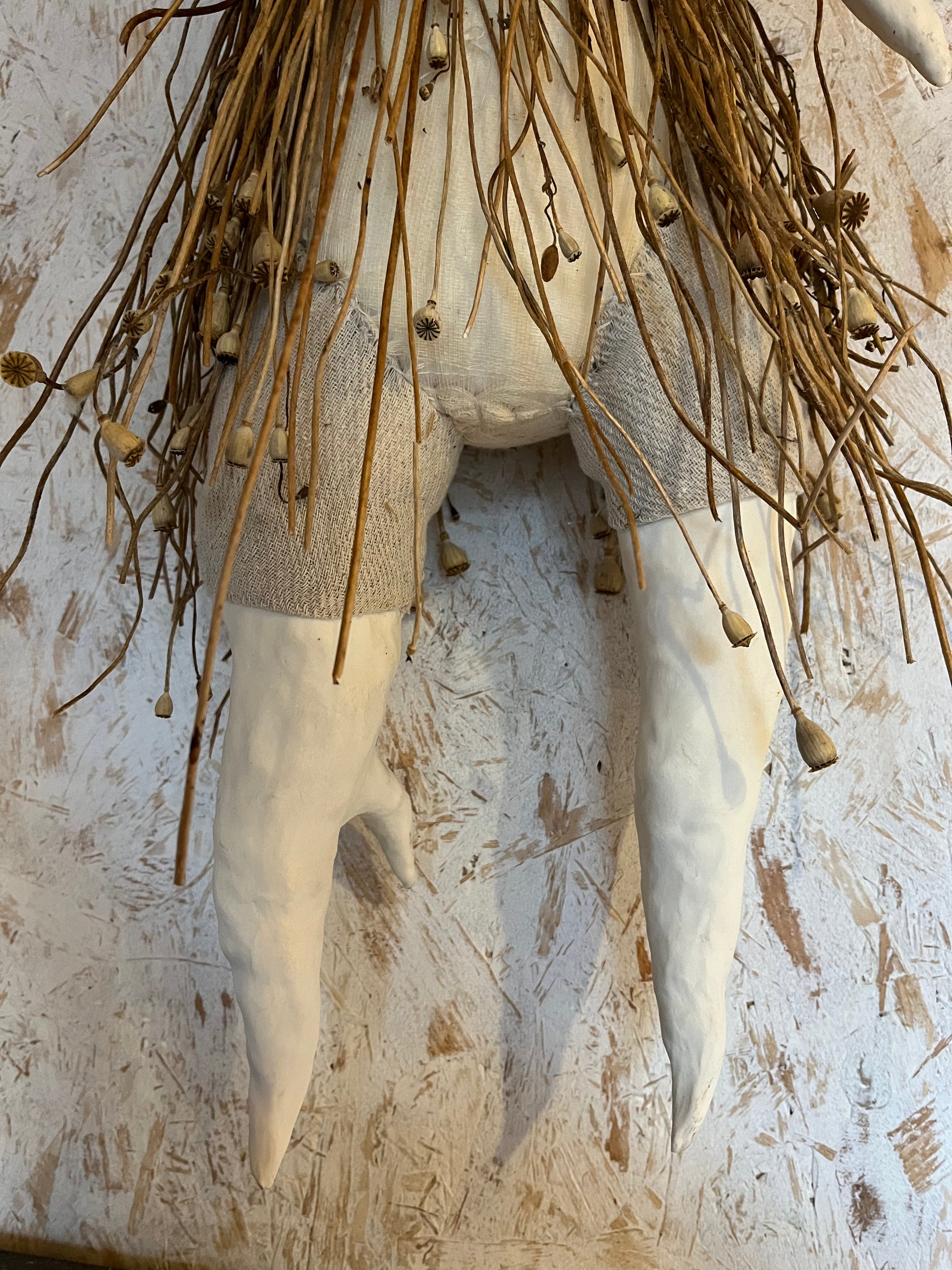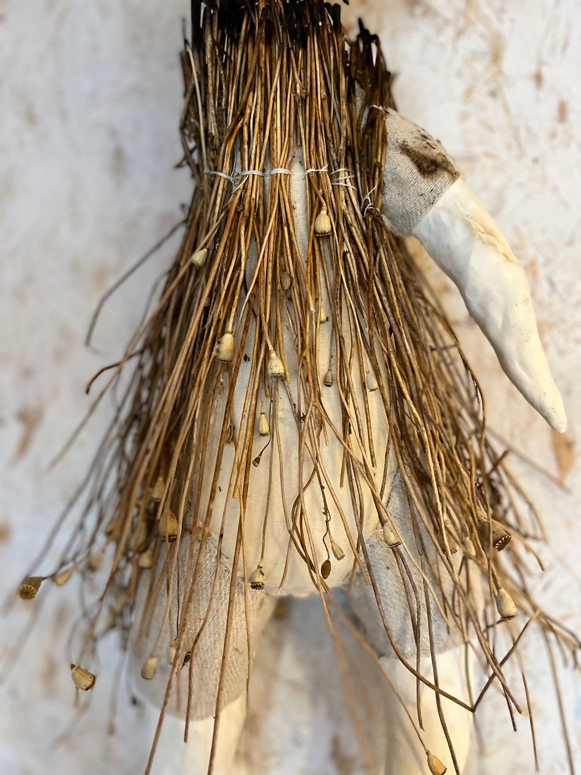 A very large poppet (photo of me for scale) who can be wall hung. She’s made of smoke fired porcelain, reclaimed muslin fabric, antique porcelain childrens dentures (I’ve only ever found four sets of these and they’re extremely rare), and charred long poppy stems. I love this piece and she’s probably one of my favourite things I have ever made, and I consider her one of my best.