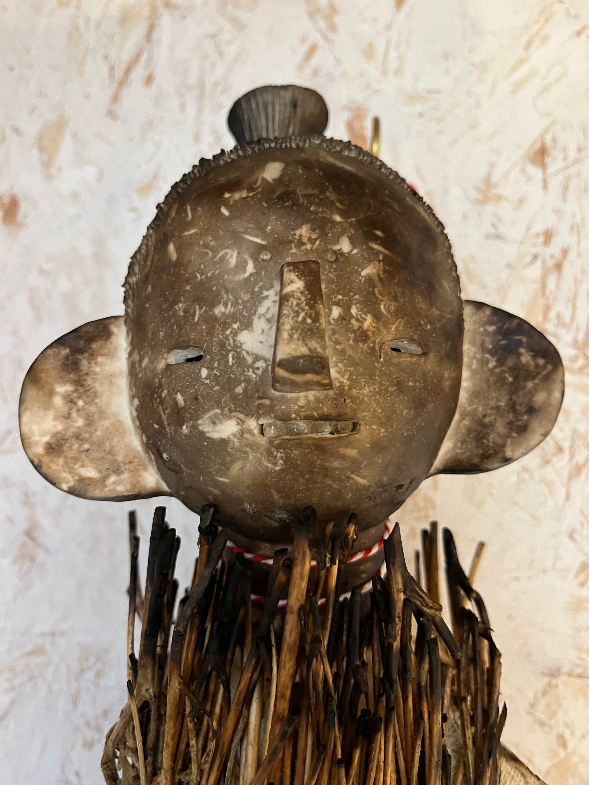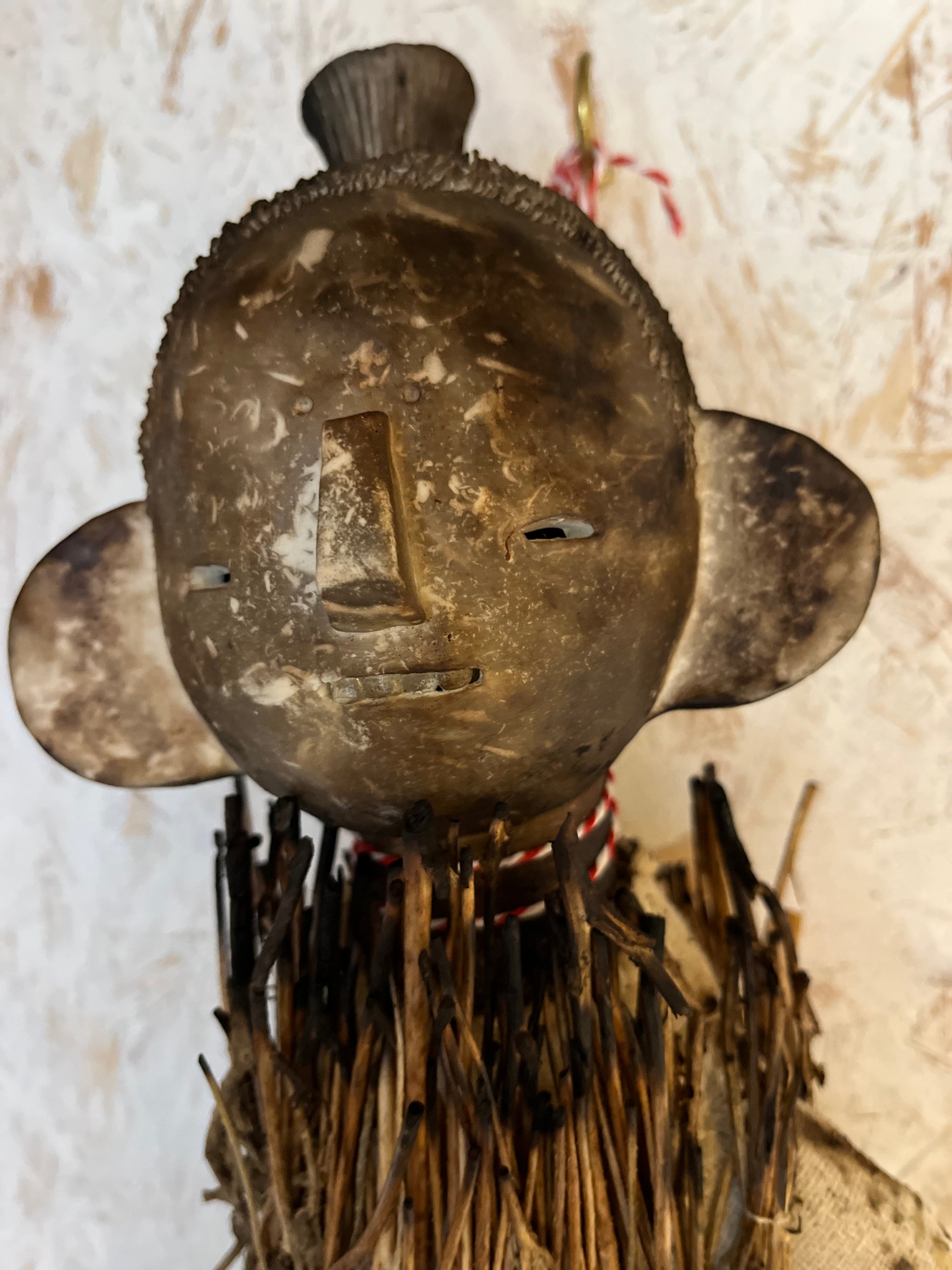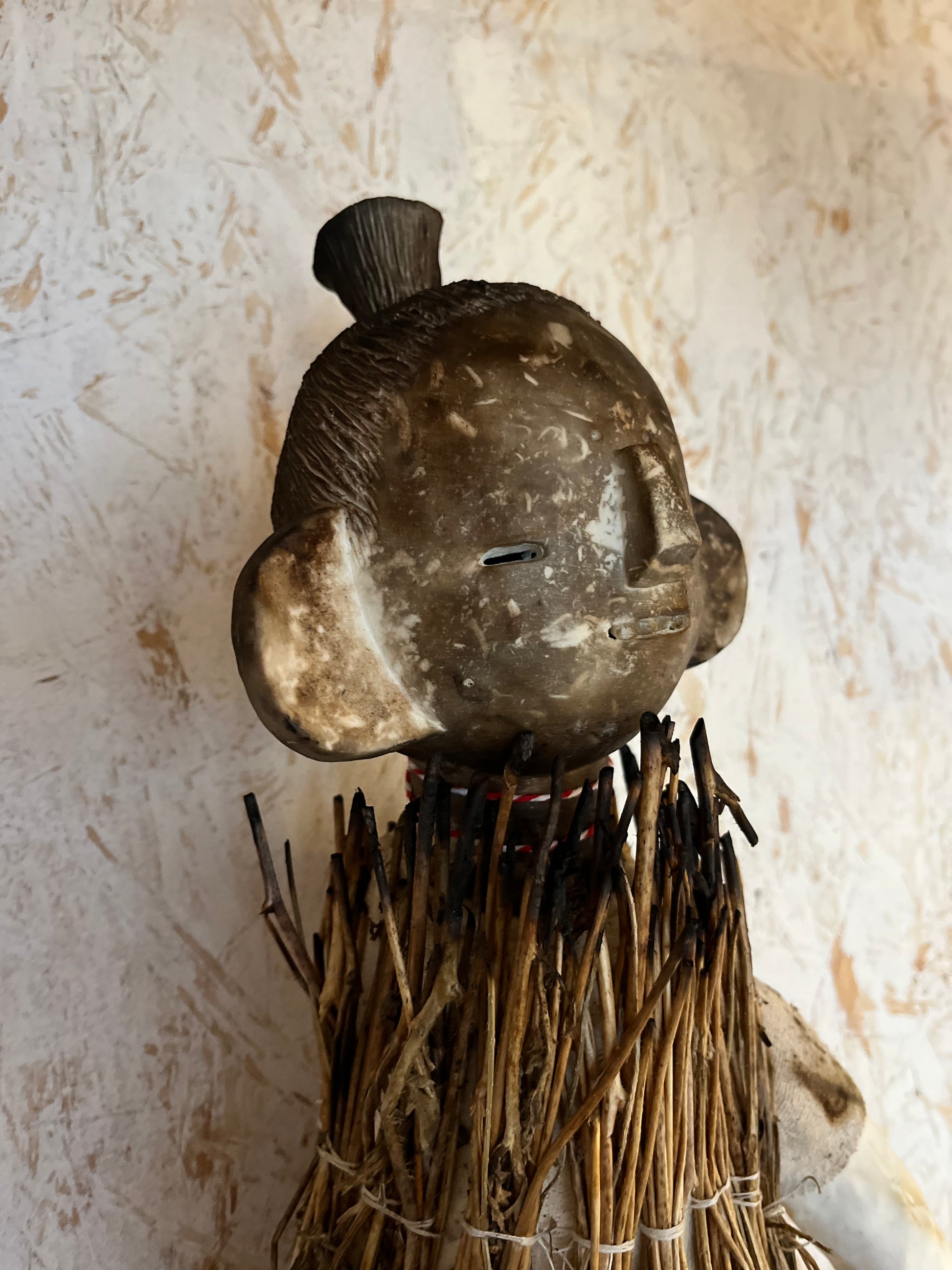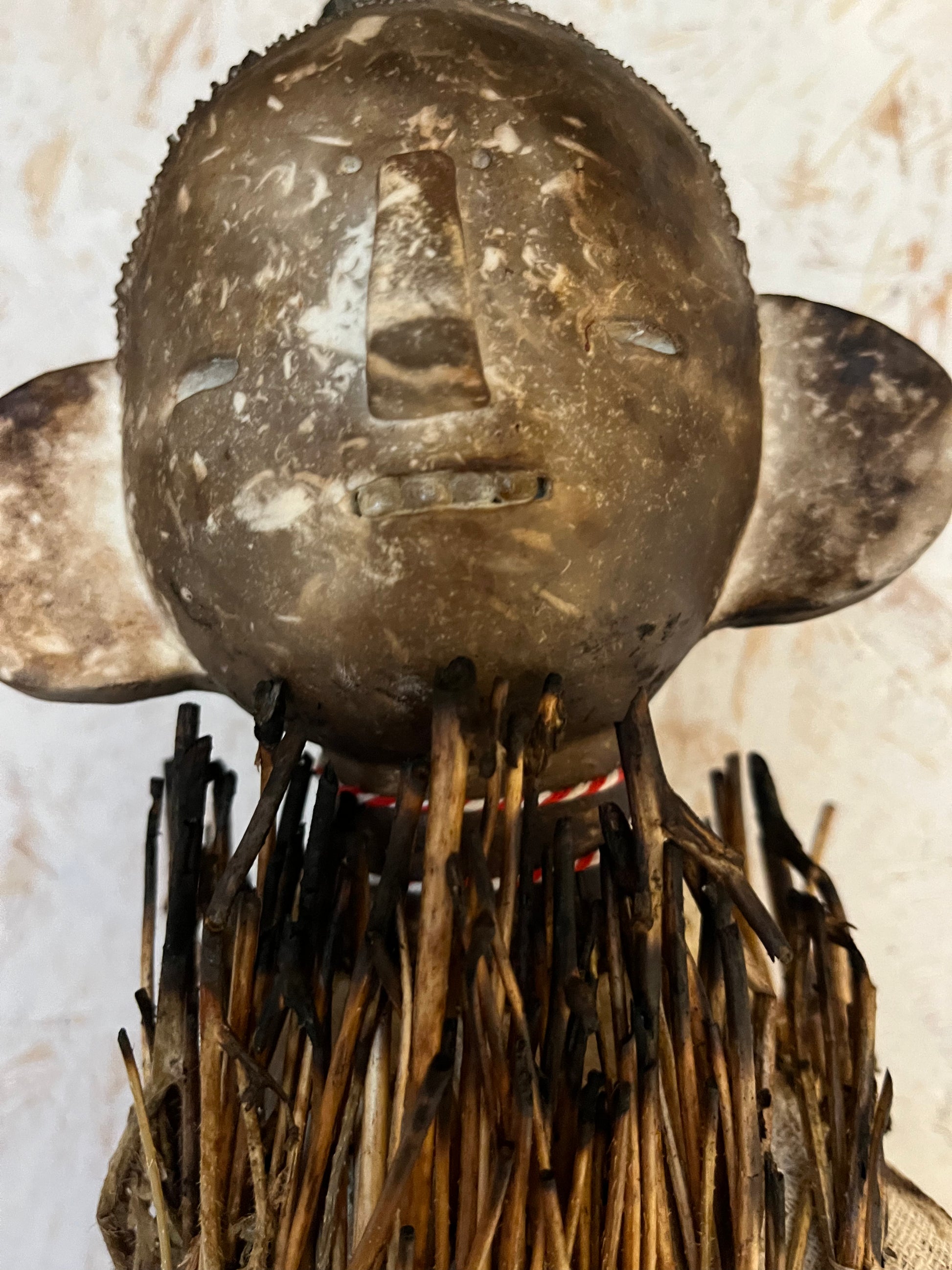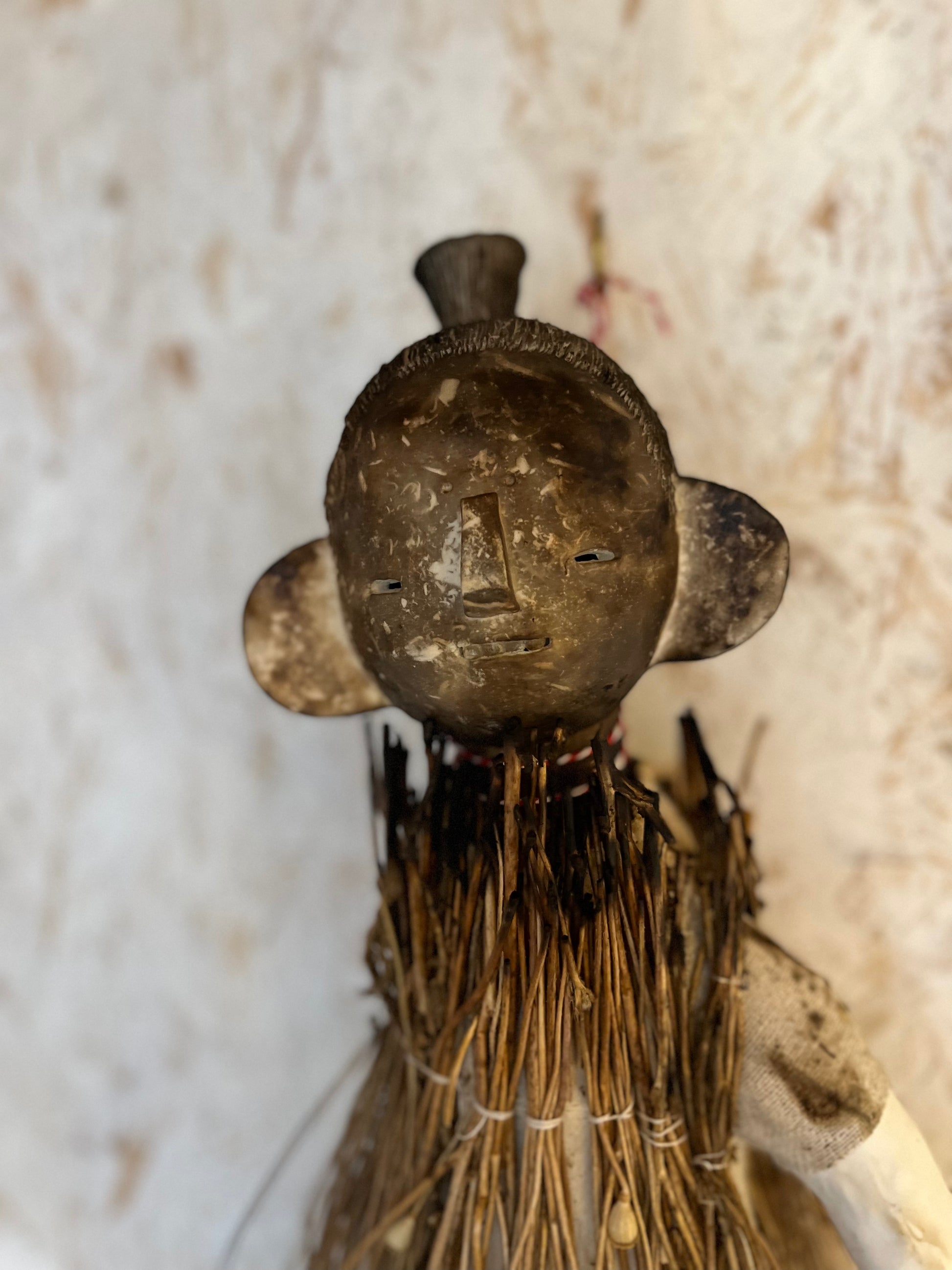 A very large poppet (photo of me for scale) who can be wall hung. She’s made of smoke fired porcelain, reclaimed muslin fabric, antique porcelain childrens dentures (I’ve only ever found four sets of these and they’re extremely rare), and charred long poppy stems. I love this piece and she’s probably one of my favourite things I have ever made, and I consider her one of my best.